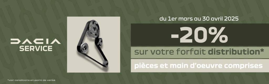 Dacia : *Offre valable du 1er mars au 30 avril 2025, dans les concessions et agences Dacia du Groupe Jean Rouyer Automobiles, dans la limite des stocks disponibles non cumulable avec toutes offres en cours. Le remplacement du kit de distribution (courroie de distribution et galets tendeurs de distribution), de la courroie accessoires, de la pompe à eau et du liquide de refroidissement de marque Renault ou Value +. voir conditions supplémentaires en point de vente.
