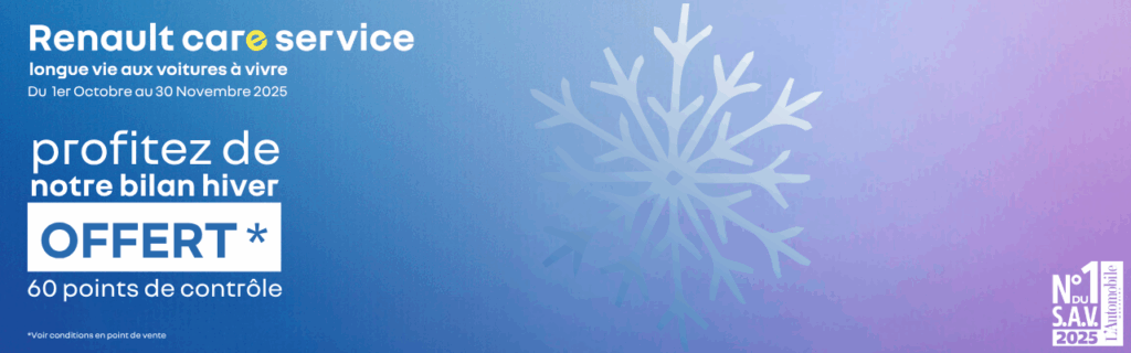 * l’offre comprend 60 points de contrôle, dont les suivants et la main d’œuvre : balais d’essuie glaces avant et arrière, phares, feux arrière, stop, clignotants avant et arrière, antibrouillards avant et arrière, feux de détresse avant et arrière, feux de recul, éclairage des plaques d’immatriculation, pare-brise, rétroviseurs, miroirs, voyants de tableau de bord, boîte d’ampoules, kit de sécurité, niveaux d’huile moteur et d’huile de direction assistée selon le modèle ou la version, liquides de refroidissement, de frein et de lave-glace, pression et usure des pneumatiques, roue de secours ou kit de gonflage, batterie, disques et plaquettes de frein avant et arrière, flexibles de frein, amortisseurs. le forfait conditions générales complètes de l’offre disponible en point de vente. en dehors de cette offre, les opérations de même nature en cours, réservées aux particuliers sur les véhicules toutes marques (hors véhicules de PTAC > 3,5 t), ne sont pas cumulables. valable du 1er octobre au 30 novembre 2025 dans les concessions Renault du Groupe Jean Rouyer Automobiles et son réseau d’agents participants