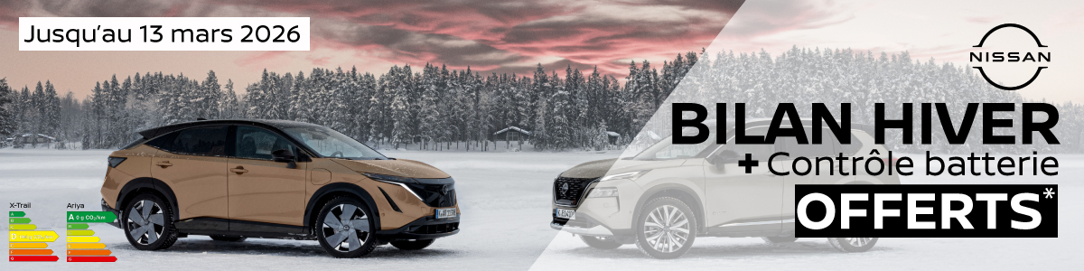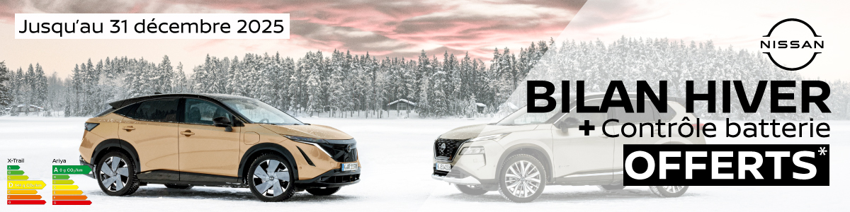 *un diagnostic sécurité en 58 points, la remise à niveau de l’huile et du lave-glace ainsi que la pression des pneus, seront effectués gratuitement pour les clients présentant leur véhicule Nissan dans une concession participante. Offre valable du 25/11/2025 au 31/12/2025. Cet engagement est uniquement réservé aux propriétaires (particuliers et professions libérales) de véhicules particuliers Nissan, hors utilitaires. Aucune intervention ne sera effectuée sur le véhicule du client sans signature préalable du devis par ce dernier. Liste des points de contrôle disponible en concession.