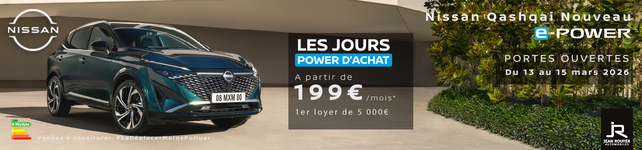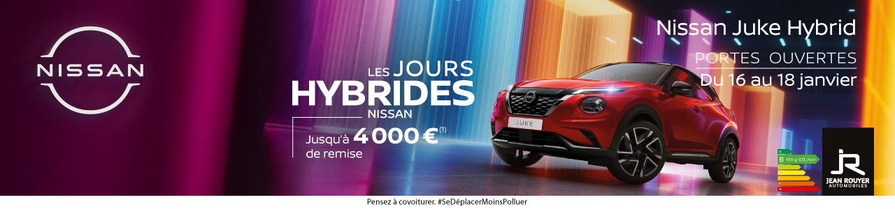 * Prolongation du 1er janvier au 31 janvier 2026 de l’offre de remise jusqu’à : 4 000€ sur Juke, 3 600€ sur Qashqai 2025 et 7 000€ sur X-Trail 2025 neufs identifiés en stock par rapport aux prix au 01/10/2025 (hors peinture métallisée). Offre réservée aux particuliers, applicable aux motorisations Essence et Hybride, dans la limite des stocks disponibles et non cumulable avec d’autres offres chez les concessionnaires Nissan participants. Modèles présentés : versions spécifiques. NISSAN WEST EUROPE :