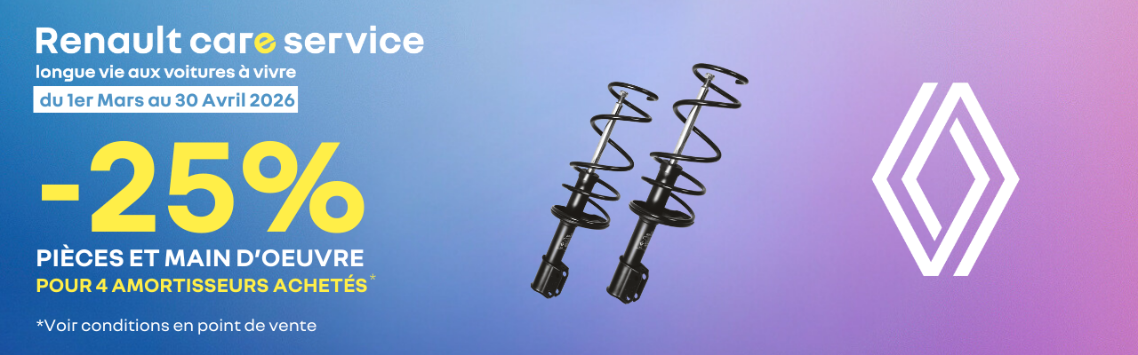 *Offre valable du 1er Mars au 30 Avril 2026 dans les concessions Renault du groupe Jean Rouyer et son réseau d’Agents participants. -20% de remise pour 2 amortisseurs achetés et -25% de remise pour 4 amortisseurs achetés sur la pièce et la main d’oeuvre. Offre valable uniquement sur les forfaits publics et sur les pièces Renault, Value + ou Motrio. Offre non cumulable avec toutes offres en cours. Hors butées amortisseurs, amortisseurs de la gamme Renault Sport et les amortisseurs pilotés. Visuels non contractuels. Offre dans la limite du stock disponible.