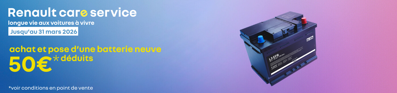 *Jusqu’au 31 mars 2026 inclus, pour l’achat et pose d’une batterie neuve, 50€ déduits pour l’achat et la pose d’une batterie de marque Renault, Value+, ou Motrio sous condition de pose. Offre non cumulable avec les opérations de même nature en cours, réservée aux particuliers sur les véhicules toutes marques, hors véhicules de PTAC > à 3,5 t et hors véhicules électriques. Garantie 3 ans pièces, 1 an main d’œuvre et recyclage des batteries usagées inclus.