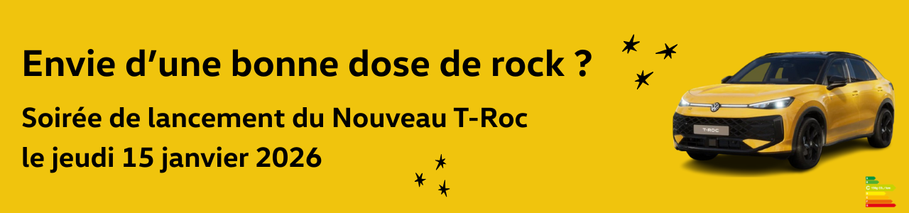 Nous avons le plaisir de vous convier au lancement exclusif du nouveau T-Roc, qui se tiendra le jeudi 15 janvier 2026 au sein de votre concession Volkswagen la Roche-sur-Yon.